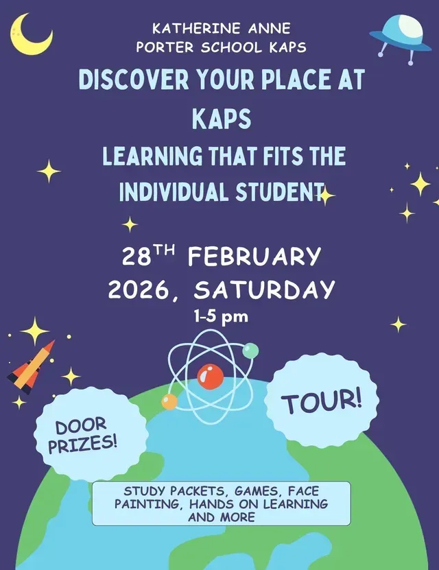 Join us Feb 28th from 1-5PM to discover your place at KAPS - Learning that fits the individual student. There will be door prizes, games, study packets, face painting, hands on learning, campus tours and more!